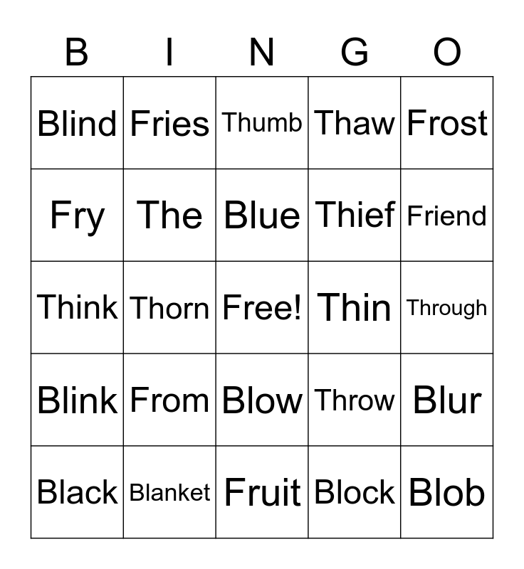 This bingo card has a free space and 34 words: Frog, Block, Front, Them, Blink, The, Frost, Black, Fries, frame, Blue, Thumb, Blend, Third, Thin, Friend, Blanket, Think, From, Throw, Blow, Thorn, Blind, Through, Fruit, Blob, Thaw, Their, Thief, Fry, Blame, Thorn, Blur and Bland.