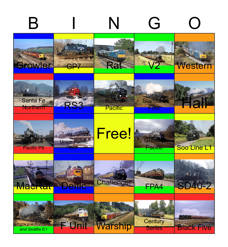 This bingo card has 24 images, a free space and 24 words: Deltic, F Unit, Bulleid Pacific, Spokane,Portland and Seattle E1, Western, Growler, Santa Fe Northern, GP7, Gresley Pacific, Challenger, Standard Four, Southern Pacific P8, FPA4, SD40-2, RS3, Century Series, Soo Line L1, Rat, Hall, Union Pacific C57, Black Five, MacRat, V2 and Warship.