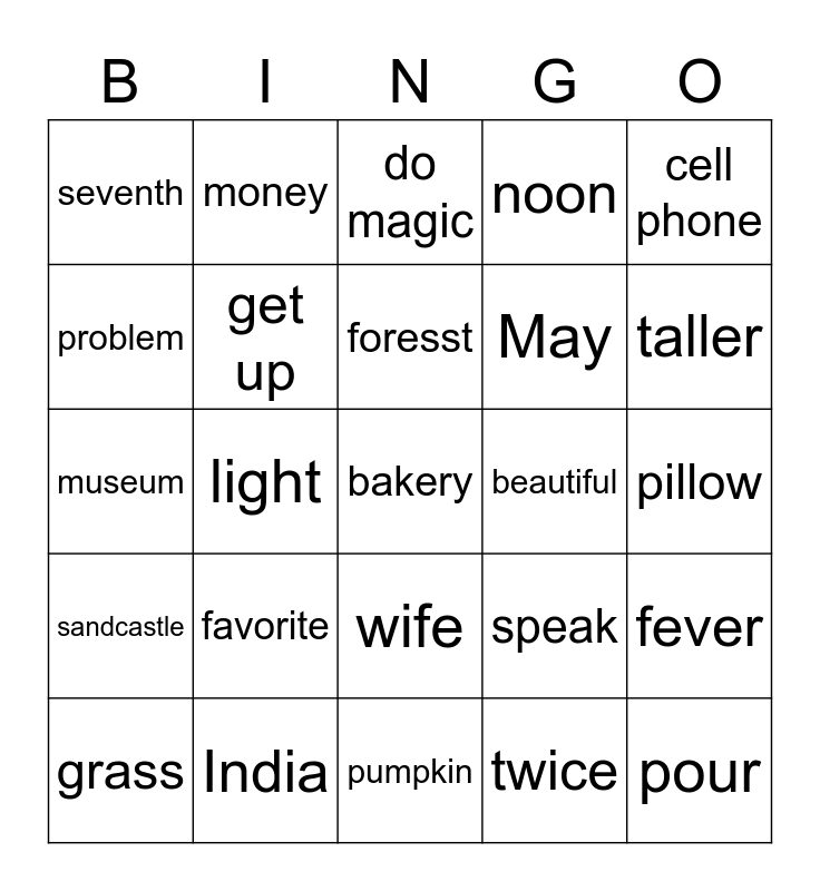 This bingo card has a free space and 24 words: favorite, India, foresst, grass, cell phone, seventh, problem, money, beautiful, wife, May, museum, speak, fever, get up, twice, pillow, do magic, taller, light, pour, sandcastle, noon and pumpkin.