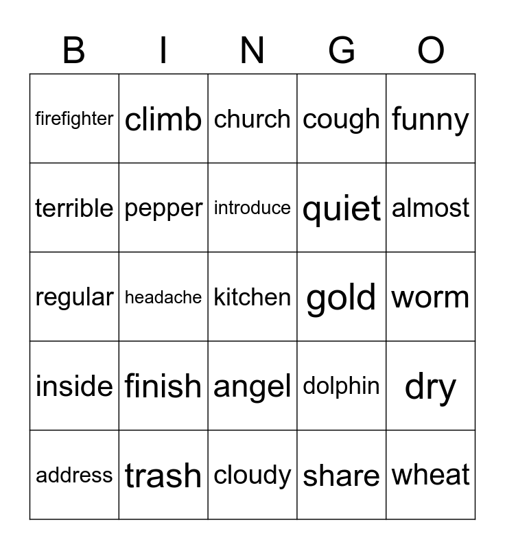This bingo card has a free space and 24 words: finish, trash, introduce, address, funny, firefighter, terrible, climb, gold, angel, quiet, regular, dolphin, dry, pepper, share, worm, church, almost, headache, wheat, inside, cough and cloudy.