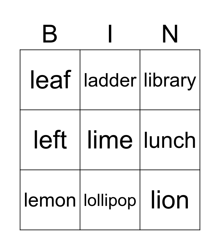 This bingo card has a free space and 8 words: lunch, library, ladder, lemon, leaf, lion, left and lollipop.