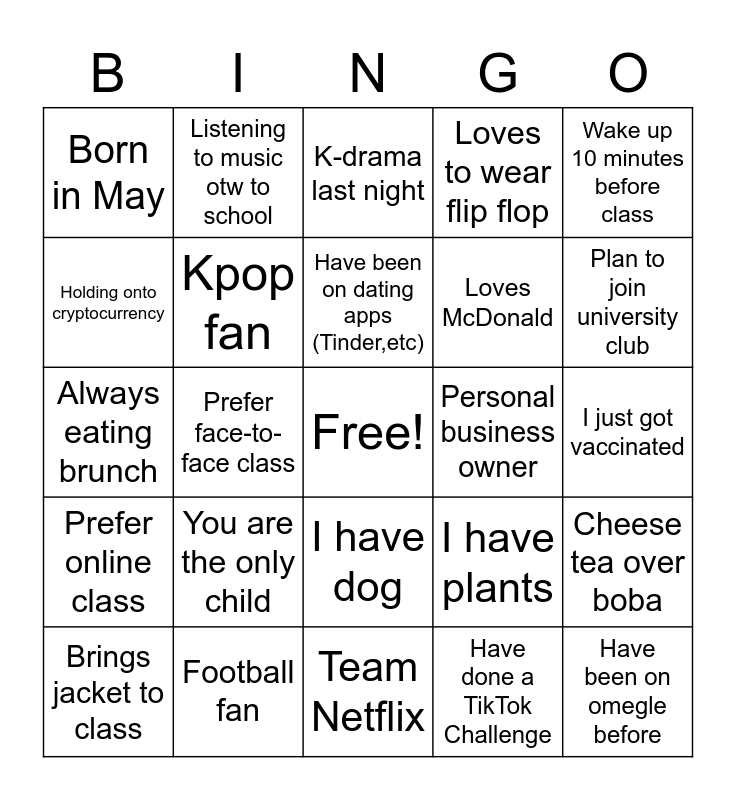This bingo card has a free space and 24 words: You are the only child, Football fan, Have been on dating apps (Tinder,etc), Brings jacket to class, Wake up 10 minutes before class, Born in May, Holding onto cryptocurrency, Listening to music otw to school, Personal business owner, I have dog, Loves McDonald, Always eating brunch, I have plants, Cheese tea over boba, Kpop fan, Have done a TikTok Challenge, I just got vaccinated, K-drama last night, Plan to join university club, Prefer face-to-face class, Have been on omegle before, Prefer online class, Loves to wear flip flop and Team Netflix.