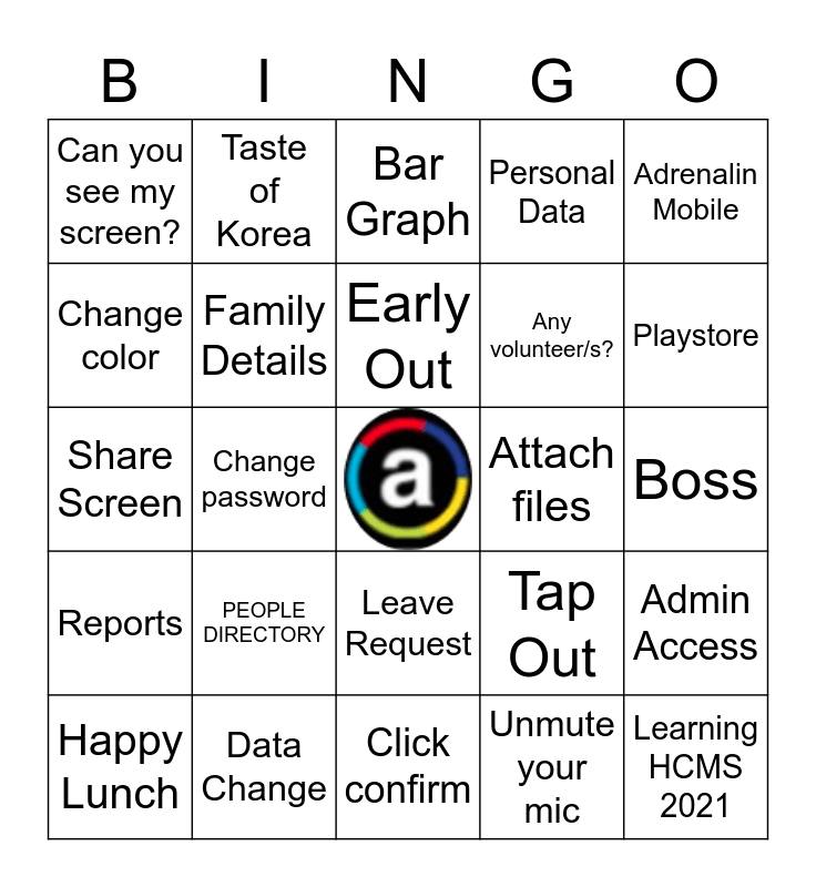 This bingo card has 2 images, a free space and 64 words: ZOLOG, ATTENDANCE CALENDAR, SMART APPROVAL, Admin Access, HR FOUNDATION, SELF SERVICE, Taste of Korea, KSY, Early Out, Tip of your Fingers, Leave Request, Subordinates, Boss, Adrenalin Mobile, Security, Change color, Change password, Can you see my screen?, Can you hear me?, Any volunteer/s?, PEOPLE DIRECTORY, Reports, Personal Data, Resignation Pullback, Employee Movement, Adhoc Shift Roster GADC, My Team Dashboard, Widget Gallery, Learning HCMS 2021, SARA, Happy Lunch, Slow Internet Connection, Leave Call, Loading Screen, Tap Out, Data Change, Transfer, Share Screen, Unmute your mic, Guardian, Family Details, Discipline Management Records, Attach files, White background, Profile Picture, Org Chart, Playstore, Leave call, Graveyard, Overtime, E Scheduler, Signout, PDF, Sitemap, Reason for Resignation, Exit Interview, Work Abroad, Session Expired, Bar Graph, Click confirm, RCO, ABC, BC and fsffsdfdsf.