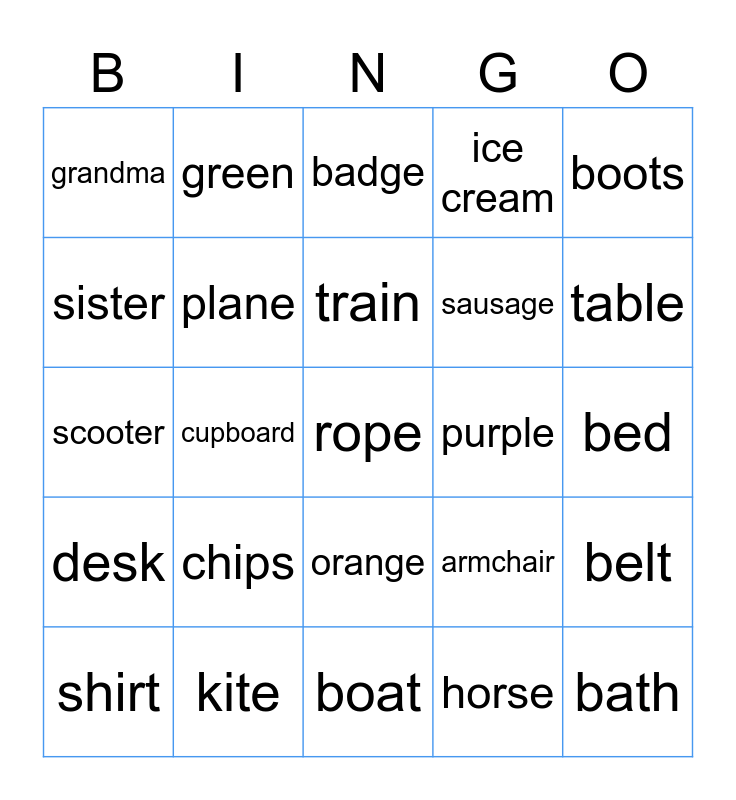 This bingo card has 25 words: chips, boat, train, shirt, boots, grandma, sister, green, purple, orange, sausage, scooter, armchair, belt, plane, bath, bed, badge, table, cupboard, rope, kite, desk, ice cream and horse.