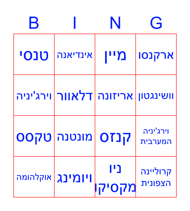 This bingo card has 50 words: אוהיו, אוקלהומה, אורגון, איווה, איידהו, אילינוי, אינדיאנה, אלבמה, דלאוור, אלסקה, אריזונה, ארקנסו, ג'ורג'יה, דקוטה הדרומית, דקוטה הצפונית, הוואי, וושינגטון, ויומינג, ויסקונסין, וירג'יניה, וירג'יניה המערבית, ורמונט, טנסי, טקסס, יוטה, לואיזיאנה, מונטנה, מיזורי, מיין, מינסוטה, מיסיסיפי, מישיגן, מסצ'וסטס, מרילנד, נבדה, נברסקה, ניו ג'רזי, ניו המפשייר, ניו יורק, ניו מקסיקו, פלורידה, פנסילבניה, קולורדו, קונטיקט, קליפורניה, קנזס, קנטקי, קרוליינה הדרומית, קרוליינה הצפונית and רוד איילנד.