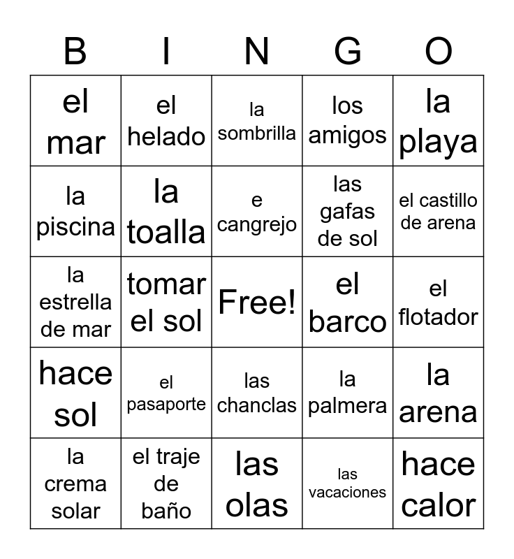 This bingo card has a free space and 24 words: el pasaporte, el traje de baño, e cangrejo, la crema solar, la playa, el mar, la piscina, el helado, el barco, las chanclas, las gafas de sol, la estrella de mar, la palmera, la arena, la toalla, las vacaciones, el flotador, la sombrilla, el castillo de arena, tomar el sol, hace calor, hace sol, los amigos and las olas.