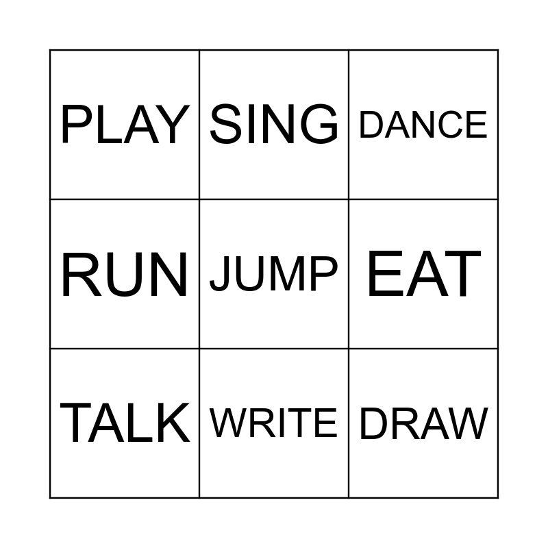 This bingo card has a free space and 11 words: READ, WRITE, DRAW, TALK, SING, DANCE, EAT, SLEEP, RUN, PLAY and LISTEN.