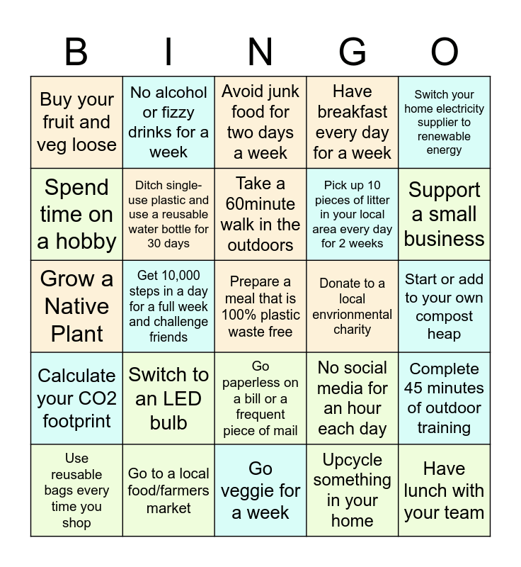 This bingo card has 25 words: Switch to an LED bulb, Go veggie for a week, Take a 60minute walk in the outdoors, Use reusable bags every time you shop, Switch your home electricity supplier to renewable energy, Buy your fruit and veg loose, Spend time on a hobby, No alcohol or fizzy drinks for a week, Donate to a local envrionmental charity, Go paperless on a bill or a frequent piece of mail, Pick up 10 pieces of litter in your local area every day for 2 weeks, Grow a Native Plant, No social media for an hour each day, Complete 45 minutes of outdoor training, Ditch single-use plastic and use a reusable water bottle for 30 days, Have lunch with your team, Start or add to your own compost heap, Avoid junk food for two days a week, Support a small business, Get 10,000 steps in a day for a full week and challenge friends, Prepare a meal that is 100% plastic waste free, Go to a local food/farmers market, Calculate your CO2 footprint, Have breakfast every day for a week and Upcycle something in your home.
