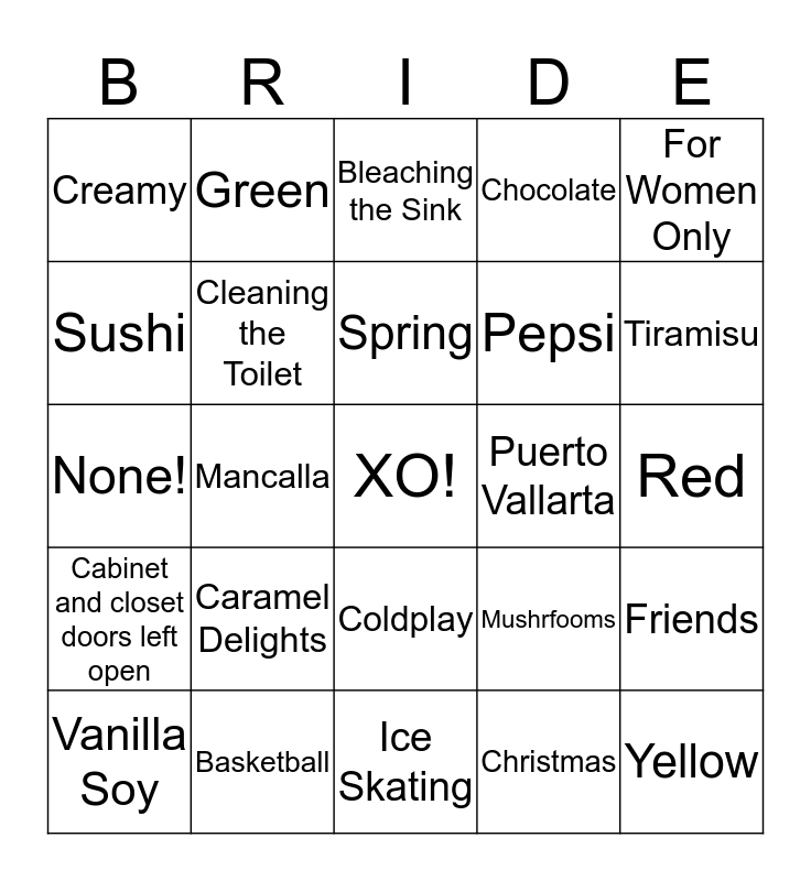 This bingo card has a free space and 31 words: Ice Skating, Midnight, Mancalla, P.E., Creamy, Bleaching the Sink, Cleaning the Toilet, Mushrfooms, Puerto Vallarta, Christmas, Red, Yellow, Alligators, Tom Hanks, Tiramisu, Vanilla Chocolate, Friends, Caramel Delights, Cabinet and closet doors left open, Coldplay, For Women Only, Huevos Rancheros, Vanilla Soy, Green, Pepsi, Sushi, Chocolate, None!, Basketball, Spring and Mary Poppins.