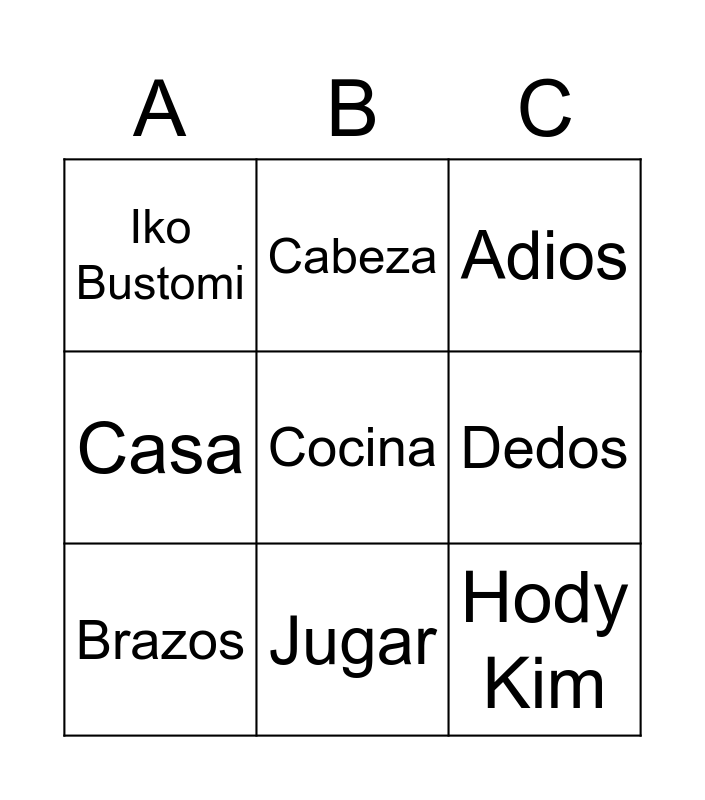 This bingo card has 45 words: Pastel, Lumpia, Lemper, Yang, Chagi :(, Boo, Iko Bustomi, Jesslyn Lim, Hody Kim, Orejas, Cabeza, Piernas, Brazos, Estomago, Rodillas, Dedos de los Pies, Hombros, Nariz, Ojos, Boca, Dedos, Hola, Me llamo, Adios, Gracias, De nada, Por favor, Mamá, Papá, Hermano, Hermana, Abuela, Abuelo, Tio, Tia, Libro, Lápiz, Papel, Profesora, Casa, Cocina, Cuarto, Sala, Jugar and Bailar.