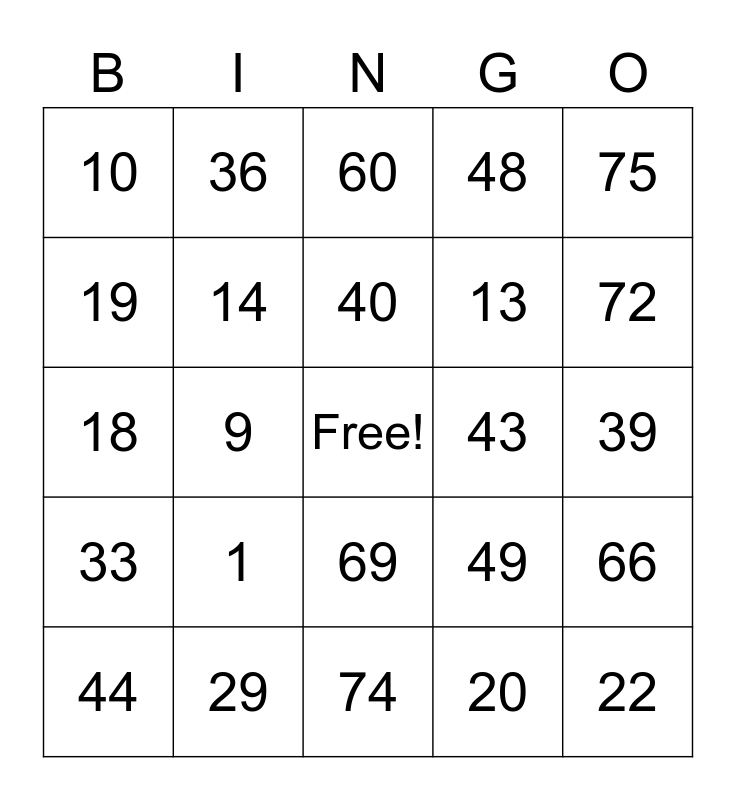 This bingo card has a free space and 24 words: 1, 29, 40, 44, 75, 10, 19, 36, 43, 69, 13, 18, 49, 66, 14, 20, 39, 60, 72, 9, 22, 33, 48 and 74.