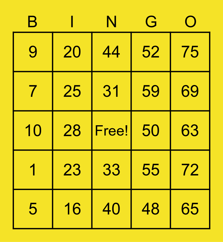 This bingo card has a free space and 24 words: 5, 23, 31, 48, 75, 9, 20, 44, 50, 63, 10, 25, 55, 72, 7, 16, 40, 52, 69, 1, 28, 33, 59 and 65.