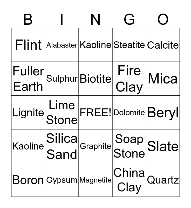 This bingo card has a free space and 24 words: Silica Sand, Gypsum, Biotite, Boron, Calcite, Flint, Fuller Earth, Alabaster, Dolomite, Graphite, Fire Clay, Lignite, Soap Stone, Slate, Sulphur, China Clay, Beryl, Kaoline, Mica, Lime Stone, Quartz, Kaoline, Steatite and Magnetite.