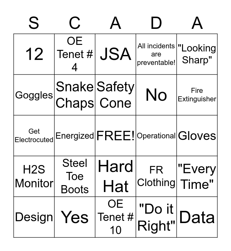 This bingo card has a free space and 24 words: Steel Toe Boots, Yes, Safety Cone, Design, "Looking Sharp", 12, Goggles, OE Tenet # 4, Operational, Hard Hat, No, Get Electrocuted, FR Clothing, "Every Time", Snake Chaps, "Do it Right", Gloves, JSA, Fire Extinguisher, Energized, Data, H2S Monitor, All incidents are preventable! and OE Tenet # 10.