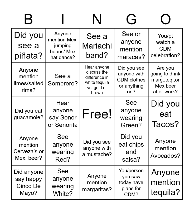 This bingo card has a free space and 29 words: Did anyone say happy Cinco De Mayo?, Anyone say Happy Mex. Independence Day?, Hear anyone say Senor or Senorita, Anyone Say Ole?, Did you see a piñata?, See a Mariachi band?, See a Sombrero?, See anyone wearing Red?, See anyone wearing Green?, See anyone wearing White?, Did you eat Tacos?, Anyone mention tequila?, Anyone mention margaritas?, You/person you saw today have plans for CDM?, Are you going to drink marg.,teq.,or Mex beer after work?, Did you see a Mexican Flag?, Did you see anyone with a mustache?, Anyone mention Cerveza's or Mex. beer?, You/pt watch a CDM celebration?, Did you eat guacamole?, Did you eat chips and salsa?, Did you hear Mexican music?, Did you see anyone with CDM clothes or anything on?, Anyone mention limes/salted rims?, See or anyone mention maracas?, Anyone mention Mex. jumping beans/ Mex hat dance?, Anyone mention Avocados?, Hear anyone discuss the difference in white tequila vs. gold or brown and Anyone say "Andale, " or Arriba, "".