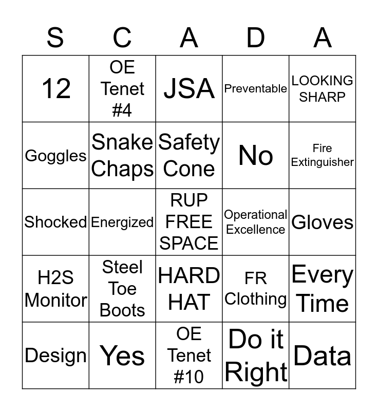 This bingo card has a free space and 24 words: Steel Toe Boots, Yes, Safety Cone, Design, LOOKING SHARP, 12, Goggles, OE Tenet #4, Operational Excellence, HARD HAT, No, Shocked, FR Clothing, Every Time, Snake Chaps, Do it Right, Gloves, JSA, Fire Extinguisher, Energized, Data, H2S Monitor, Preventable and OE Tenet #10.