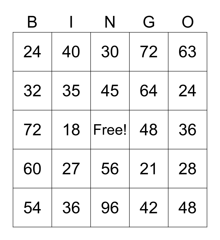 This bingo card has a free space and 24 words: 27, 36, 45, 54, 63, 24, 32, 40, 48, 56, 64, 72, 21, 28, 35, 42, 36, 30, 24, 18, 48, 60, 72 and 96.