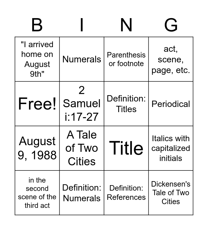 This bingo card has 16 words: Definition: Numerals, Italics with capitalized initials, Parenthesis or footnote, "I arrived home on August 9th", August 9, 1988, Numerals, Title, Definition: References, Free!, 2 Samuel i:17-27, in the second scene of the third act, act, scene, page, etc., A Tale of Two Cities, Periodical, Definition: Titles and Dickensen's Tale of Two Cities.