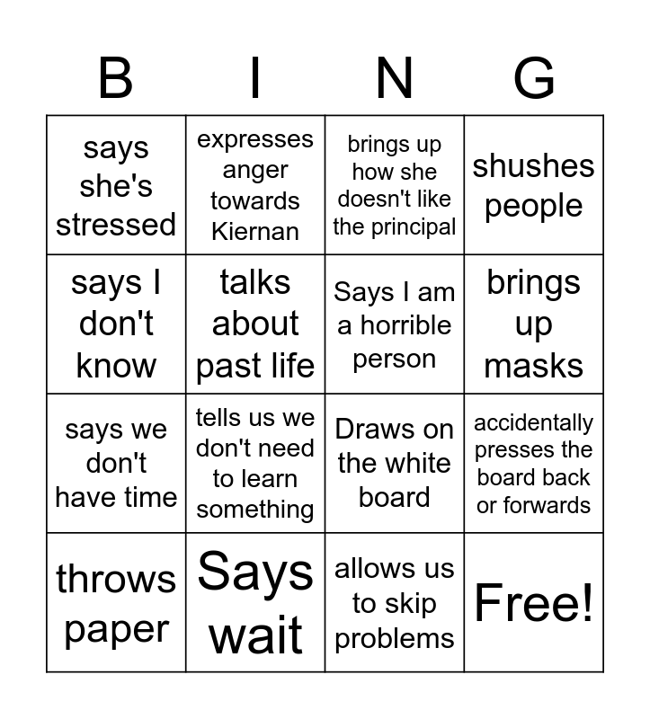This bingo card has 16 words: Says wait, accidentally presses the board back or forwards, brings up how she doesn't like the principal, says she's stressed, says we don't have time, expresses anger towards Kiernan, Draws on the white board, allows us to skip problems, says I don't know, talks about past life, throws paper, shushes people, tells us we don't need to learn something, brings up masks, Says I am a horrible person and Free!.