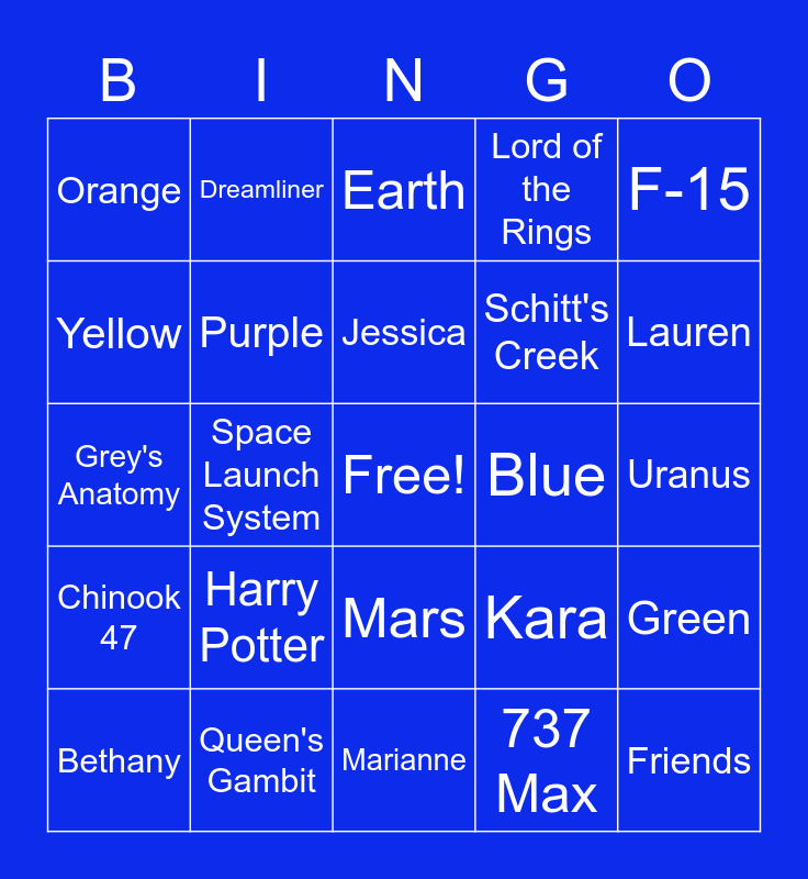 This bingo card has a free space and 26 words: Jupiter, Harry Potter, Marianne, 737 Max, Lauren, Orange, Dreamliner, Earth, Schitt's Creek, Green, Grey's Anatomy, Space Launch System, Kara, Friends, Chinook 47, Venus, Jessica, Blue, F-15, Bethany, Purple, Mars, Lord of the Rings, Uranus, Yellow and Queen's Gambit.