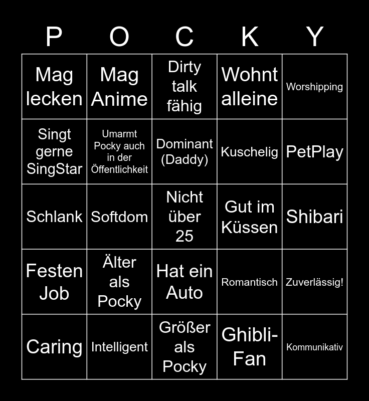 This bingo card has 25 words: Älter als Pocky, Größer als Pocky, Dominant (Daddy), Caring, Worshipping, Mag lecken, Singt gerne SingStar, Mag Anime, Gut im Küssen, Hat ein Auto, Kuschelig, Schlank, Romantisch, Zuverlässig!, Umarmt Pocky auch in der Öffentlichkeit, Kommunikativ, Shibari, Dirty talk fähig, PetPlay, Softdom, Nicht über 25, Intelligent, Festen Job, Wohnt alleine and Ghibli-Fan.