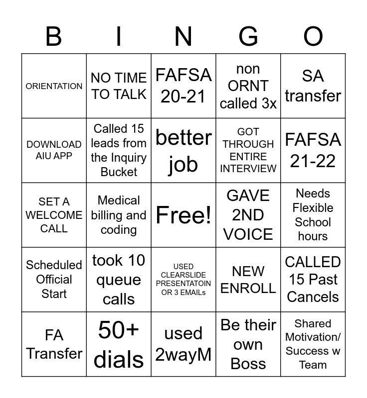 This bingo card has a free space and 24 words: took 10 queue calls, 50+ dials, better job, FA Transfer, SA transfer, ORIENTATION, DOWNLOAD AIU APP, NO TIME TO TALK, GAVE 2ND VOICE, USED CLEARSLIDE PRESENTATOIN OR 3 EMAILs, GOT THROUGH ENTIRE INTERVIEW, SET A WELCOME CALL, NEW ENROLL, CALLED 15 Past Cancels, Called 15 leads from the Inquiry Bucket, Be their own Boss, Needs Flexible School hours, FAFSA 20-21, FAFSA 21-22, Medical billing and coding, Shared Motivation/ Success w Team, Scheduled Official Start, non ORNT called 3x and used 2wayM.