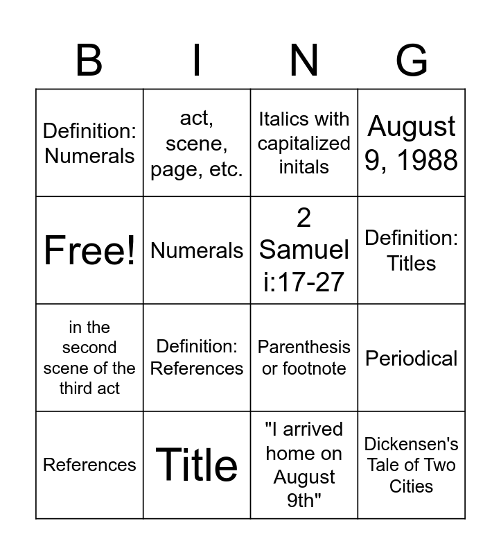 This bingo card has 16 words: Title, Periodical, Italics with capitalized initals, Definition: Numerals, in the second scene of the third act, act, scene, page, etc., Parenthesis or footnote, "I arrived home on August 9th", Free!, Numerals, References, August 9, 1988, Definition: References, Definition: Titles, 2 Samuel i:17-27 and Dickensen's Tale of Two Cities.