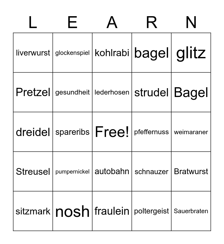 This bingo card has a free space and 28 words: Bratwurst, noodle, strudel, poltergeist, Pretzel, kohlrabi, glockenspiel, Streusel, pfeffernuss, sitzmark, dreidel, bagel, nosh, fraulein, Bagel, kucheen, pumpernickel, gesundheit, lederhosen, autobahn, liverwurst, dachshund, Sauerbraten, spareribs, weimaraner, schnauzer, glitz and rottweiler.