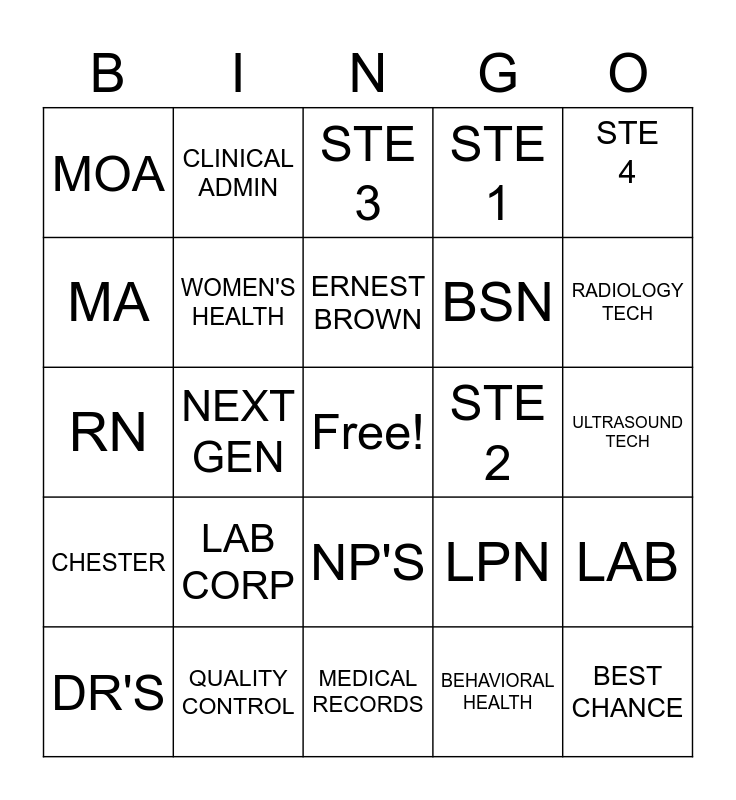 This bingo card has a free space and 24 words: LAB CORP, QUALITY CONTROL, ERNEST BROWN, DR'S, STE 4, MOA, MA, CLINICAL ADMIN, STE 2, NP'S, BSN, RN, LPN, LAB, WOMEN'S HEALTH, BEHAVIORAL HEALTH, ULTRASOUND TECH, STE 3, RADIOLOGY TECH, NEXT GEN, BEST CHANCE, CHESTER, STE 1 and MEDICAL RECORDS.