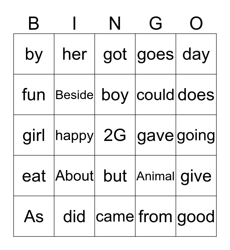 This bingo card has a free space and 24 words: About, did, boy, As, day, by, fun, her, gave, but, could, girl, Animal, give, Beside, from, going, got, does, happy, good, eat, goes and came.