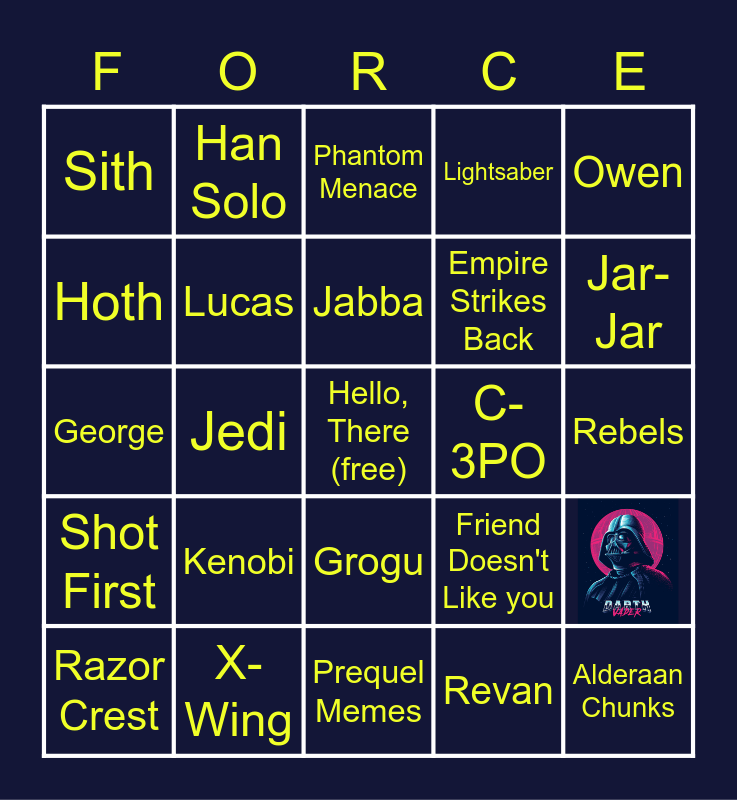 This bingo card has 4 images, a free space and 60 words: Luke, Leia, Han Solo, Blue Milk, Jabba, Boba Fett, Grogu, New Hope, Rebels, Owen, Poe, Hoth, Jedi, Sith, Jango, Empire Strikes Back, Kenobi, Shot First, Lightsaber, Qi'ra, Maz, Dooku, Thrawn, Cody, Rey, Fin, Beskar, Tarkin, Lando, Ewok, Jar-Jar, Razor Crest, Mando, Revan, Rogue 1, Lucas, George, C-3PO, R2D2, Din Djarin, Nien Nunb, Alderaan Chunks, X-Wing, Unkar Plutt, Friend Doesn't Like you, This is the Way, Cobb Vanth, Nerf Herder, Prequel Memes, BB-8, Revenge of the Sith, The Clone Wars, Phantom Menace, The Force Awakening, Rise of Skywalker, The Last Jedi, Return of the Jedi, Star Wars Holiday Special, Green Milk and Malik.