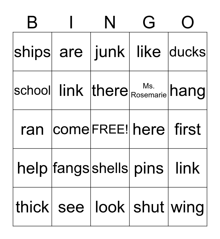 This bingo card has a free space and 24 words: fangs, see, there, thick, ducks, ships, school, are, here, shells, Ms. Rosemarie, ran, pins, link, link, shut, first, junk, hang, come, wing, help, like and look.