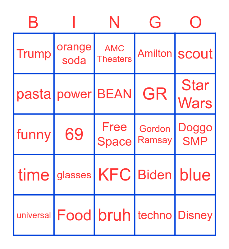 This bingo card has a free space and 29 words: America, Food, AMC Theaters, money, scout, Trump, power, BEAN, Gordon Ramsay, blue, universal, 69, techno, Disney, funny, red, bruh, Biden, Star Wars, time, glasses, Midway Mania, GR, Doggo SMP, pasta, orange soda, KFC, Amilton and Harry Potter.