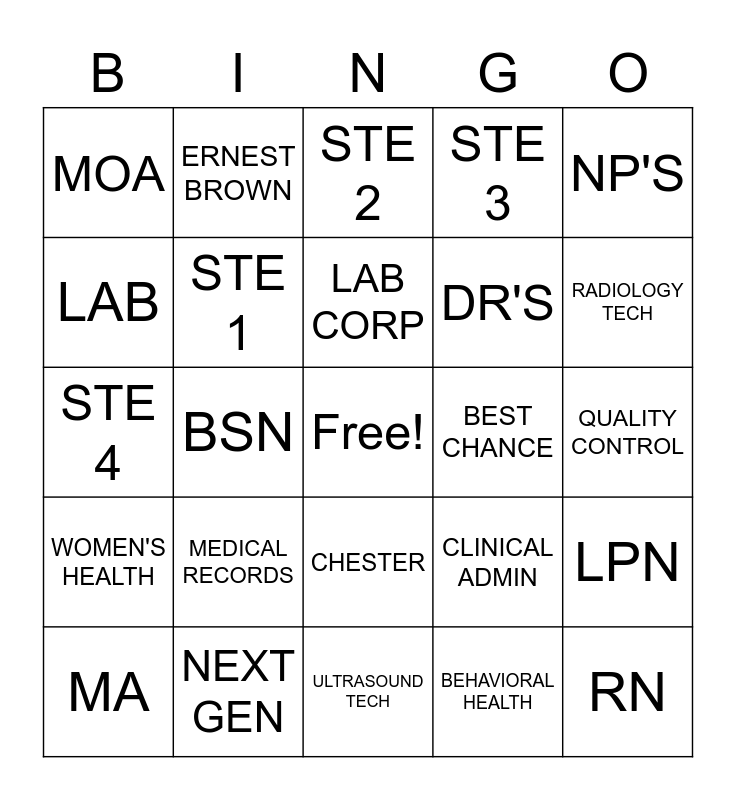 This bingo card has a free space and 24 words: MEDICAL RECORDS, NEXT GEN, LAB CORP, MA, NP'S, MOA, LAB, ERNEST BROWN, BEST CHANCE, CHESTER, DR'S, STE 4, CLINICAL ADMIN, LPN, STE 1, BEHAVIORAL HEALTH, QUALITY CONTROL, STE 2, RADIOLOGY TECH, BSN, RN, WOMEN'S HEALTH, STE 3 and ULTRASOUND TECH.