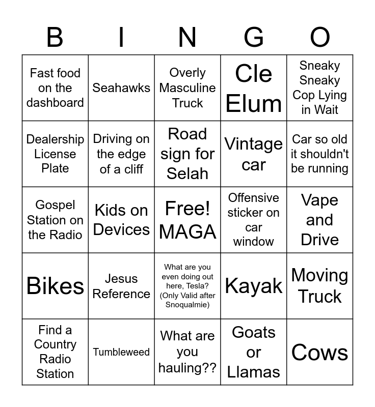 This bingo card has a free space and 45 words: Pro-Democrat Political Sign, Cows, License plates from more than 3 states away, Find a Country Radio Station, Green Roofs, Goats or Llamas, Overly Masculine Truck, The biggest US flag you've ever seen in your life, Sneaky Sneaky Cop Lying in Wait, Tumbleweed, Cle Elum, Offensive sticker on car window, What are you even doing out here, Tesla? (Only Valid after Snoqualmie), Jesus Reference, Military Reference, What are you hauling??, Bavarian style building, Gospel Station on the Radio, Pleas for Public Safety, Car so old it shouldn't be running, Seahawks, This is my mom's car, I could walk faster than you're driving, Fast food on the dashboard, Trailer going way too fast, Vape and Drive, Muddin', Roadside Produce, Kayak, Bikes, Illegal Tinting, Moving Truck, Motorcyclist, Nothing but static on the radio, What's your hurry? (Speeding in excess), Kids on Devices, Left Lane Camper, I thought we already crossed that river???, Waterfalls, Road sign for Selah, Dealership License Plate, Vintage car, Road Trash- How'd that get there??, Driving on the edge of a cliff and Dogspotting.
