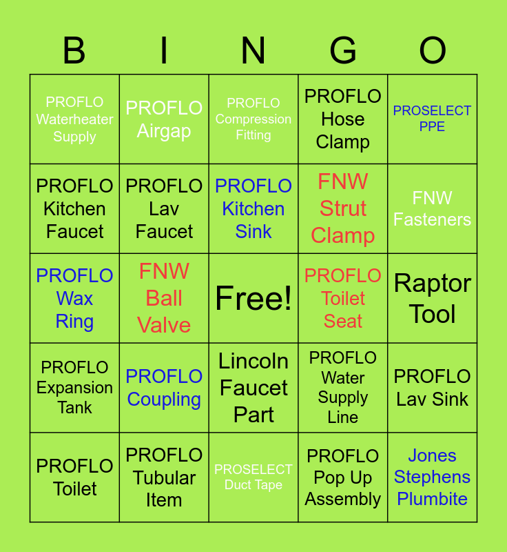 This bingo card has a free space and 29 words: PROFLO Toilet, PROFLO Shower Drain, FNW Ball Valve, OwnBrand Toilet Flapper, PROFLO Waterheater Supply, PROFLO Compression Fitting, PROFLO Lav Faucet, PROFLO Coupling, PROFLO Toilet Seat, PROFLO Tubular Item, Raptor Tool, Jones Stephens Plumbite, PROSELECT Duct Tape, PROFLO Pop Up Assembly, FNW Fasteners, PROFLO Angle Stop, Lincoln Faucet Part, PROFLO Expansion Tank, PROSELECT PPE, PROFLO Wax Ring, PROFLO Water Supply Line, PROFLO Caulking, FNW Strut Clamp, PROFLO Kitchen Faucet, PROFLO Hose Clamp, PROFLO Airgap, PROFLO Lav Sink, PROFLO Kitchen Sink and PROFLO Complete Toilet in Box.