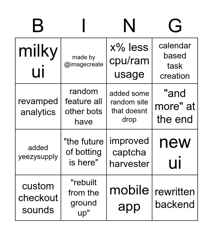 This bingo card has 19 words: improved captcha harvester, run x more tasks, x% less cpu/ram usage, rewritten backend, new ui, revamped analytics, mobile app, milky ui, made by @imagecreate, added yeezysupply, "the future of botting is here", random feature all other bots have, added some random site that doesnt drop, "rebuilt from the ground up", custom checkout sounds, online dashboard w/ analytics, calendar based task creation, "and more" at the end and made by @imagecreate.