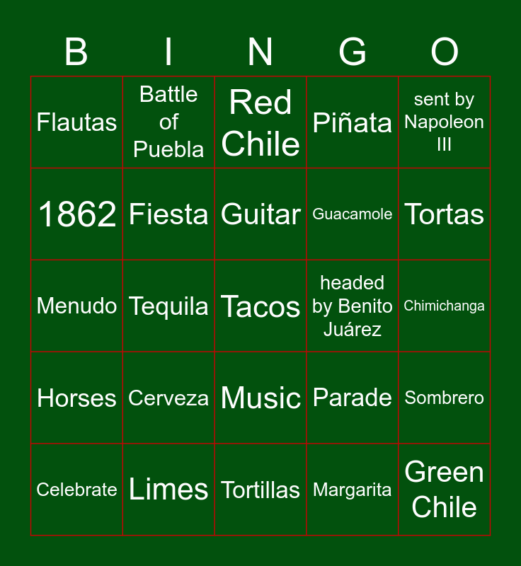 This bingo card has 46 words: Cheese, Tacos, Salsa, Tortillas, Cerveza, Tamales, Battle of Puebla, 5 de mayo, 1862, Mexico City, Fiesta, Piñata, Sombrero, Parade, Peso, Burrito, Guitar, headed by Benito Juárez, Defeats French Army, sent by Napoleon III, Tequila, Margarita, Flautas, Guacamole, Quesadilla, Tortas, Celebrate, Dance, Music, Horses, Pistols, Boots, Zarape, Ranch, Poncho, Limes, Chimichanga, Posole, Rice, Refried Beans, Green Chile, Red Chile, Menudo, Mexican Army, Victory for Mexico and Mariachi.
