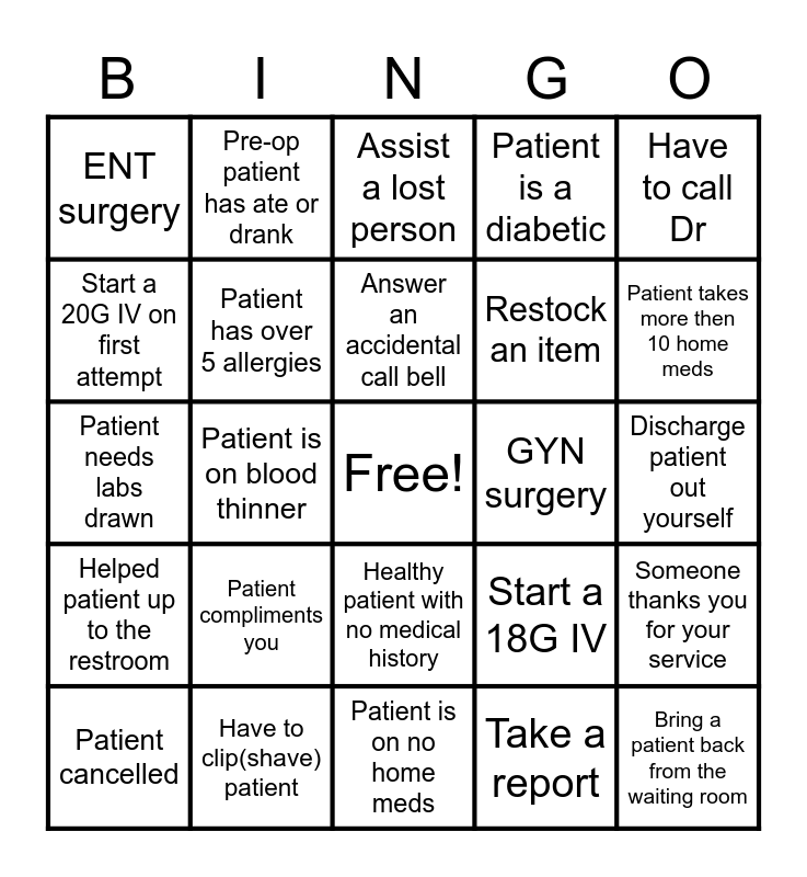 This bingo card has a free space and 60 words: Patient says they are a hard IV stick, Have to clip(shave) patient, Cardiac surgery, Helped patient up to the restroom, Take a report, Dr asks you for a pen, Patient has over 5 allergies, Patient can’t urinate, Restock an item, Assist with or Do a COVID swab, Patient is a diabetic, Plastic surgery, Start a 20G IV on first attempt, Urology surgery, You help someone else’s patient, ENT surgery, Bring a patient back from the waiting room, Have to call Dr, Patient asks for water, Answer an accidental call bell, GYN surgery, Assist a lost person, Patient cancelled, Someone thanks you for your service, Give pain medication besides narcotic, Patient tells you they are vaccinated, Patient asks same question twice, Ortho surgery, Patient takes more then 10 home meds, Patient is being admitted, Start a 16G IV, Patient originally staying is going home, Have to call anesthesia, Nursing Home patient, Pre-op patient has ate or drank, dental surgery, Complete a call back, Patient is on blood thinner, No Assistant on unit, Patient needs labs drawn, Complete a urine HCG, Patient compliments you, Discharge patient out yourself, Patient is a 3hr charge, Start a 18G IV, Total joint, Answer a call light, Neuro surgery, Difficult IV, Healthy patient with no medical history, Patient is on no home meds, Patient surgery is delayed, Answer phone in pre-op, GI surgery, Call report to PACU, Can’t read DR writing on order, Give same instruction twice due to patient question, Put a patient charge in, Place an order in the computer and Work a different area on same shift.