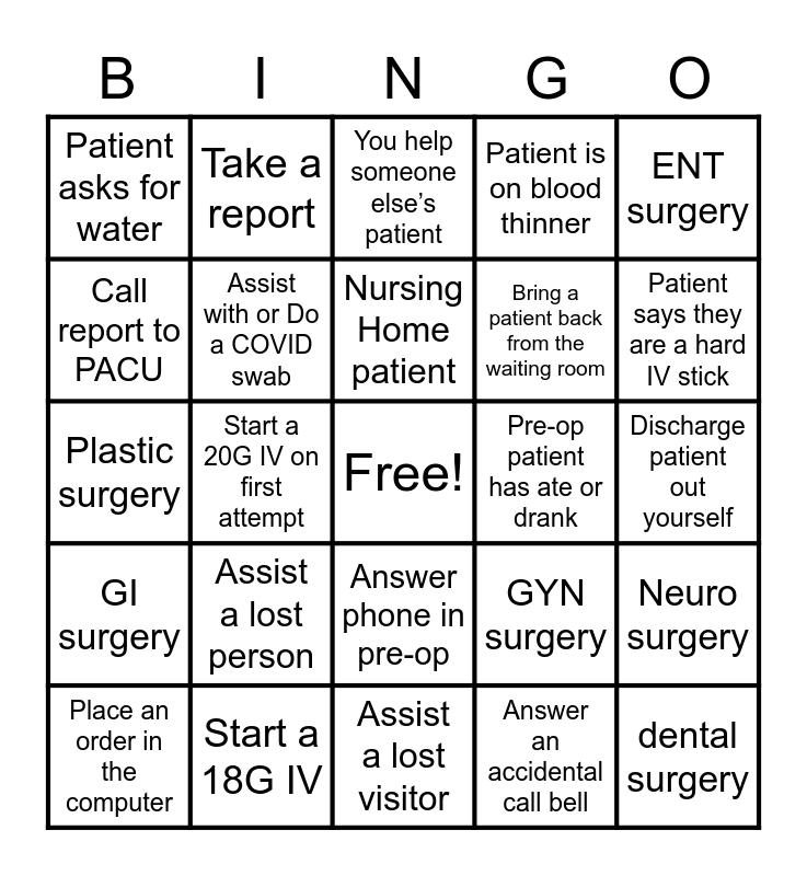 This bingo card has a free space and 64 words: Complete a call back, Answer a call light, Patient is on no home meds, Neuro surgery, Patient tells you they are vaccinated, Patient asks same question twice, Take a report, Patient surgery is delayed, Nursing Home patient, Patient can’t urinate, Answer phone in pre-op, Dr asks you for a pen, Discharge patient out yourself, ENT surgery, Complete a urine HCG, Call report to PACU, Start a 20G IV on first attempt, Patient asks for water, Patient is on a blood thinner, Bring a patient back from the waiting room, Assist a lost person, GI surgery, Patient is on blood thinner, Healthy patient with no medical history, Patient is a diabetic, Give pain medication besides narcotic, Helped patient up to the restroom, Ortho surgery, No Assistant on unit, Patient cancelled, Patient is a 3hr charge, Patient takes more then 10 home meds, Someone thanks you for your service, Difficult IV, Patient says they are a hard IV stick, Place an order in the computer, Have to call anesthesia, Answer an accidental call bell, Put a patient charge in, Assist with or Do a COVID swab, Plastic surgery, Pre-op patient has ate or drank, Patient originally staying is going home, Restock an item, Work a different area on same shift, dental surgery, Start a 18G IV, Have to call Dr, GYN surgery, Cardiac surgery, Total joint, Start a 16G IV, Assist a lost visitor, Have to clip(shave) patient, Can’t read DR writing on order, Patient compliments you, You help someone else’s patient, Take a report, Call report to PACU, Patient needs labs drawn, Give same instruction twice due to patient question, Patient has over 5 allergies, Urology surgery and Patient is being admitted.