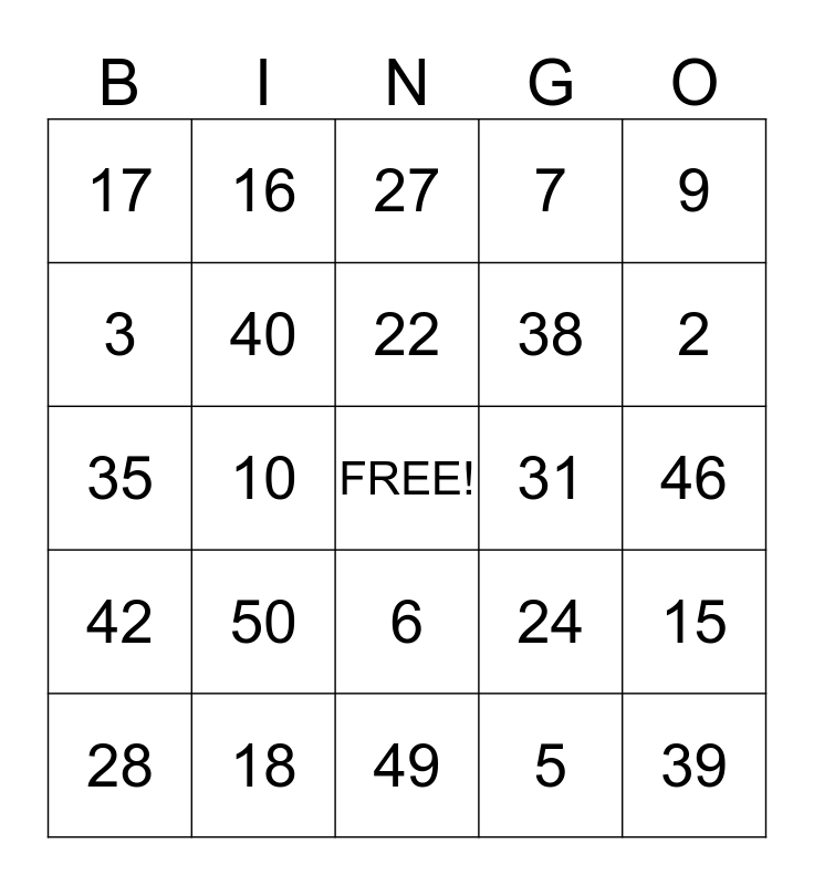 This bingo card has a free space and 24 words: 50, 18, 22, 28, 9, 17, 3, 16, 31, 6, 38, 35, 24, 15, 40, 5, 46, 27, 2, 10, 39, 42, 7 and 49.