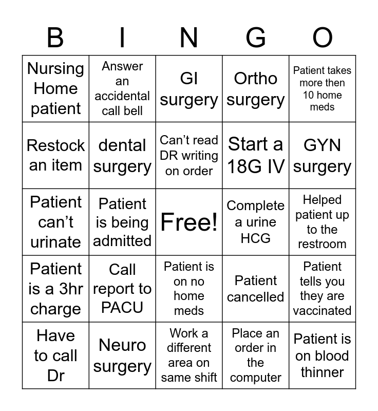 This bingo card has a free space and 64 words: Patient is on a blood thinner, Take a report, Healthy patient with no medical history, Patient tells you they are vaccinated, No Assistant on unit, Cardiac surgery, Answer an accidental call bell, Someone thanks you for your service, Can’t read DR writing on order, Call report to PACU, Patient is on no home meds, You help someone else’s patient, Helped patient up to the restroom, Patient takes more then 10 home meds, Patient needs labs drawn, Restock an item, Patient is being admitted, Nursing Home patient, Assist a lost visitor, Start a 18G IV, Call report to PACU, Patient is a 3hr charge, Ortho surgery, Total joint, Put a patient charge in, Patient says they are a hard IV stick, Answer a call light, Complete a call back, Patient compliments you, Assist a lost person, Plastic surgery, Take a report, Give same instruction twice due to patient question, Difficult IV, GYN surgery, Have to call Dr, Patient is a diabetic, Place an order in the computer, Patient has over 5 allergies, dental surgery, Patient can’t urinate, Complete a urine HCG, Patient surgery is delayed, Dr asks you for a pen, Start a 16G IV, Patient is on blood thinner, Neuro surgery, Give pain medication besides narcotic, Patient cancelled, Urology surgery, Assist with or Do a COVID swab, Patient asks same question twice, Work a different area on same shift, Start a 20G IV on first attempt, Bring a patient back from the waiting room, Have to call anesthesia, GI surgery, Pre-op patient has ate or drank, Discharge patient out yourself, Answer phone in pre-op, Patient asks for water, ENT surgery, Have to clip(shave) patient and Patient originally staying is going home.