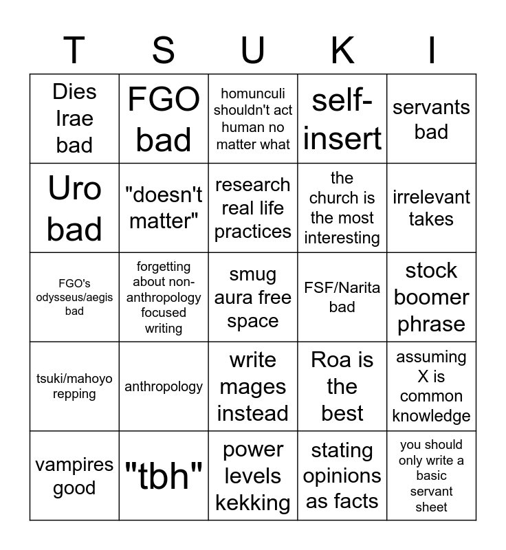 This bingo card has a free space and 24 words: anthropology, "tbh", research real life practices, vampires good, servants bad, Dies Irae bad, Uro bad, FGO bad, FSF/Narita bad, write mages instead, the church is the most interesting, FGO's odysseus/aegis bad, Roa is the best, assuming X is common knowledge, "doesn't matter", stating opinions as facts, stock boomer phrase, homunculi shouldn't act human no matter what, irrelevant takes, forgetting about non-anthropology focused writing, you should only write a basic servant sheet, tsuki/mahoyo repping, self-insert and power levels kekking.