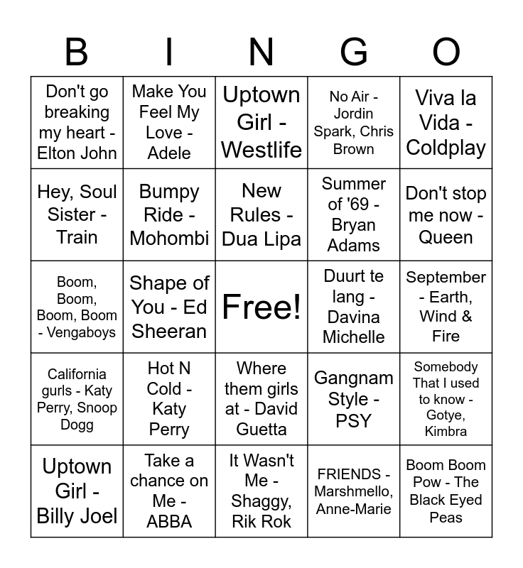 This bingo card has a free space and 49 words: Like A G6 - Far East Movement, The Cataracs, DEV, Boom Boom Pow - The Black Eyed Peas, Whole Again - Atomic Kitten, It Wasn't Me - Shaggy, Rik Rok, Hot N Cold - Katy Perry, Rap Das Armas - Cidinho & Doca, Make You Feel My Love - Adele, Fireflies - Owl City, Hey, Soul Sister - Train, Alors on Danse - Stromae, Bumpy Ride - Mohombi, No Air - Jordin Spark, Chris Brown, Somebody That I used to know - Gotye, Kimbra, Gangnam Style - PSY, Timber - Pitbull, Kesha, Leef - André Hazes Jr, New Rules - Dua Lipa, Duurt te lang - Davina Michelle, Wonderwall - Oasis, Viva la Vida - Coldplay, Shape of You - Ed Sheeran, FRIENDS - Marshmello, Anne-Marie, Don't go breaking my heart - Elton John, Summer of '69 - Bryan Adams, Havana - Camila Cabello, Young Thug, Don't stop me now - Queen, Uptown Girl - Billy Joel, Don't Stop - Fleedwood Mac, Where them girls at - David Guetta, California gurls - Katy Perry, Snoop Dogg, Life is a rollercoaster - Ronan Keating, Poker face - Lady Gaga, Talk Dirty - Jason Derulo, Californication - Red Hot Chili Peppers, Take a chance on Me - ABBA, Gimme! Gimme! Gimme! - ABBA, Sweet Child O' Mine - Guns N'Roses, Africa - Toto, September - Earth, Wind & Fire, Uptown Funk - Mark Ronson, Bruno Mars, Casanova - Ultimate Kaos, We're going to Ibiza! - Vengaboys, That Don't impress me much - Shania Twain, Show me the meaning of being lonely - Backstreet boys, Boom, Boom, Boom, Boom - Vengaboys, Uptown Girl - Westlife, Despacito - Luis Fonsi, Daddy Yankee, Dura - Daddy Yankee and Smells like teen spirit - Nirvana.