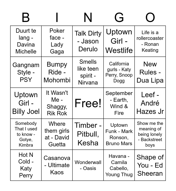 This bingo card has a free space and 49 words: Take a chance on Me - ABBA, Shape of You - Ed Sheeran, Sweet Child O' Mine - Guns N'Roses, Wonderwall - Oasis, Where them girls at - David Guetta, That Don't impress me much - Shania Twain, Poker face - Lady Gaga, Hey, Soul Sister - Train, Gangnam Style - PSY, FRIENDS - Marshmello, Anne-Marie, Bumpy Ride - Mohombi, Uptown Girl - Westlife, Show me the meaning of being lonely - Backstreet boys, Uptown Funk - Mark Ronson, Bruno Mars, Boom, Boom, Boom, Boom - Vengaboys, Whole Again - Atomic Kitten, Smells like teen spirit - Nirvana, September - Earth, Wind & Fire, No Air - Jordin Spark, Chris Brown, Life is a rollercoaster - Ronan Keating, It Wasn't Me - Shaggy, Rik Rok, Havana - Camila Cabello, Young Thug, Duurt te lang - Davina Michelle, California gurls - Katy Perry, Snoop Dogg, Africa - Toto, New Rules - Dua Lipa, Hot N Cold - Katy Perry, Alors on Danse - Stromae, Timber - Pitbull, Kesha, Somebody That I used to know - Gotye, Kimbra, Make You Feel My Love - Adele, Like A G6 - Far East Movement, The Cataracs, DEV, Dura - Daddy Yankee, Don't Stop - Fleedwood Mac, Casanova - Ultimate Kaos, Californication - Red Hot Chili Peppers, Despacito - Luis Fonsi, Daddy Yankee, We're going to Ibiza! - Vengaboys, Leef - André Hazes Jr, Rap Das Armas - Cidinho & Doca, Fireflies - Owl City, Gimme! Gimme! Gimme! - ABBA, Don't go breaking my heart - Elton John, Summer of '69 - Bryan Adams, Uptown Girl - Billy Joel, Talk Dirty - Jason Derulo, Viva la Vida - Coldplay, Don't stop me now - Queen and Boom Boom Pow - The Black Eyed Peas.