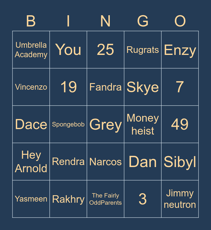 This bingo card has a free space and 24 words: Rendra, Rakhry, Fandra, Yasmeen, Enzy, Umbrella Academy, Vincenzo, You, Money heist, Narcos, Skye, Dace, Dan, Sibyl, 19, 3, 49, 25, 7, Spongebob, Jimmy neutron, Hey Arnold, Rugrats and The Fairly OddParents.