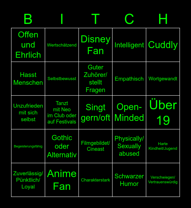 This bingo card has 25 words: Gothic oder Alternativ, Charakterstark, Guter Zuhörer/ stellt Fragen, Zuverlässig/ Pünktlich/ Loyal, Cuddly, Offen und Ehrlich, Hasst Menschen, Wertschätzend, Open-Minded, Filmgebildet/ Cineast, Empathisch, Unzufrieden mit sich selbst, Physically/ Sexually abused, Harte Kindheit/Jugend, Selbstbewusst, Verschwiegen/ Vertrauenswürdig, Über 19, Disney Fan, Wortgewandt, Tanzt mit Neo im Club oder auf Festivals, Singt gern/oft, Anime Fan, Begeisterungsfähig, Intelligent and Schwarzer Humor.