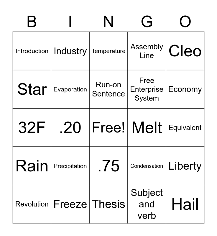This bingo card has a free space and 24 words: Precipitation, Freeze, Run-on Sentence, Revolution, Cleo, Introduction, Star, Industry, Melt, .75, Free Enterprise System, 32F, Condensation, Liberty, Evaporation, Subject and verb, Equivalent, Temperature, Economy, .20, Hail, Rain, Assembly Line and Thesis.