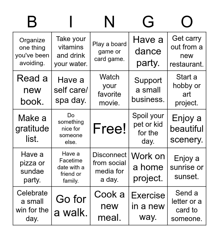 This bingo card has a free space and 24 words: Celebrate a small win for the day., Have a Facetime date with a friend or family., Watch your favorite movie., Exercise in a new way., Get carry out from a new restaurant., Organize one thing you've been avoiding., Take your vitamins and drink your water., Play a board game or card game., Spoil your pet or kid for the day., Enjoy a beautiful scenery., Make a gratitude list., Have a self care/ spa day., Work on a home project., Enjoy a sunrise or sunset., Read a new book., Go for a walk., Cook a new meal., Have a dance party., Start a hobby or art project., Have a pizza or sundae party., Do something nice for someone else., Disconnect from social media for a day., Support a small business. and Send a letter or a card to someone..
