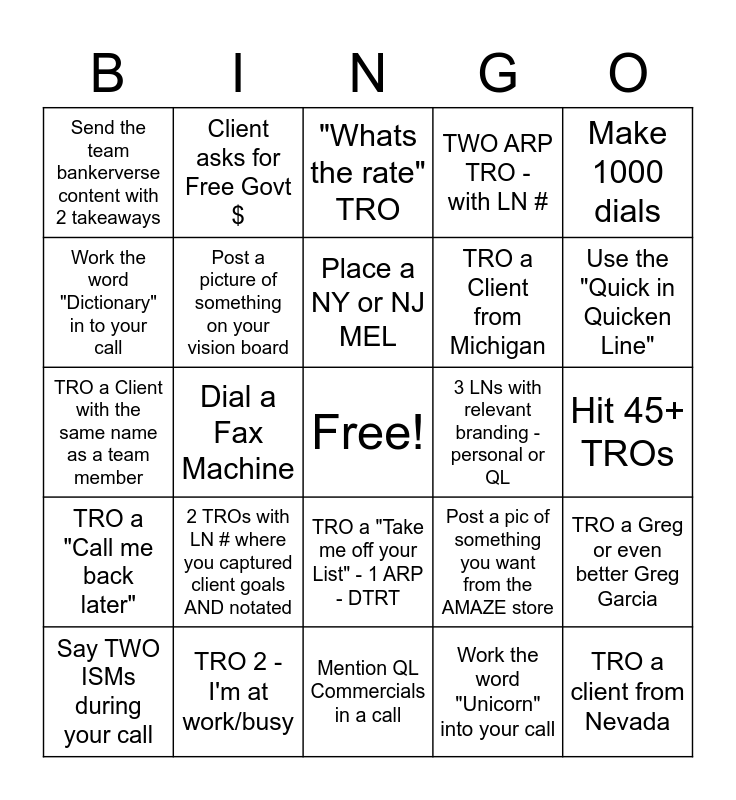 This bingo card has a free space and 24 words: 2 TROs with LN # where you captured client goals AND notated, TRO 2 - I'm at work/busy, Place a NY or NJ MEL, Say TWO ISMs during your call, Make 1000 dials, Send the team bankerverse content with 2 takeaways, Work the word "Dictionary" in to your call, Client asks for Free Govt $, 3 LNs with relevant branding - personal or QL, TRO a "Take me off your List" - 1 ARP - DTRT, TRO a Client from Michigan, TRO a Client with the same name as a team member, Post a pic of something you want from the AMAZE store, TRO a Greg or even better Greg Garcia, Post a picture of something on your vision board, Work the word "Unicorn" into your call, Hit 45+ TROs, "Whats the rate" TRO, Use the "Quick in Quicken Line", Dial a Fax Machine, TRO a client from Nevada, TRO a "Call me back later", TWO ARP TRO - with LN # and Mention QL Commercials in a call.
